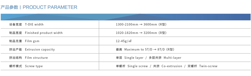 設備按制品結構所需可選擇單層/多層共擠工藝,還可裝備原料自動計量配料系統,電暈系統、瑕疵檢測、在線測厚、全自動調節模具、二次打孔、在線分切、卸卷稱重、遠程維保系統等功能件。